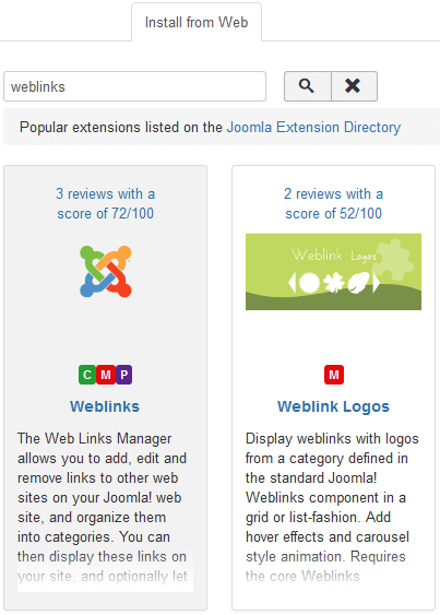 The Weblinks core extension is required (that extension is not bundled with the Joomla! core anymore - since Joomla 3.4 - and must be downloaded separately from the Joomla! Extensions Directory or installed directly from the Install from Web tab of your website).