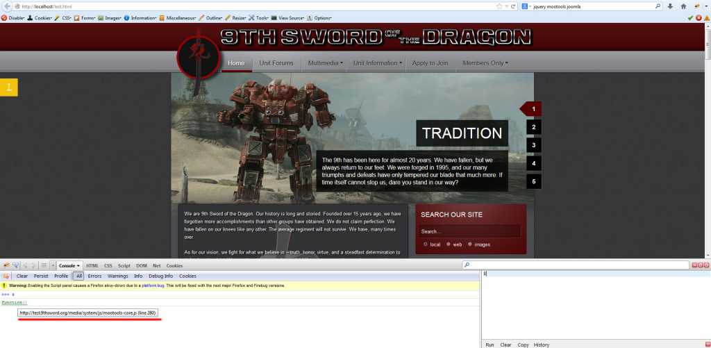ok.jpg - after saving your homepage's HTML on my local computer and removing the script, MooTools is correctly loaded and jQuery no longer overwrites it.